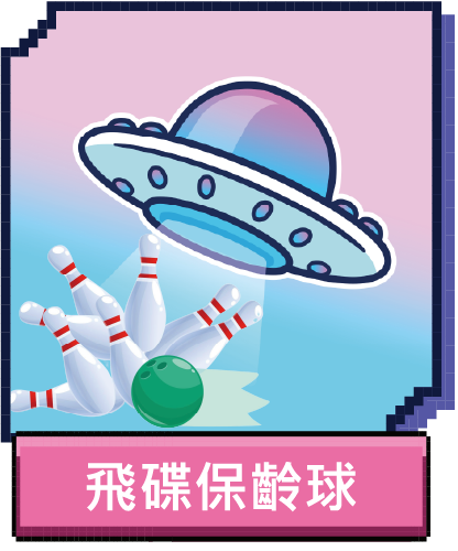 從天而降的UFO投擲出強而有力的飛碟球,限時內使用飛碟擊倒目標物,即挑戰成功。