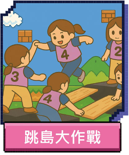 經典遊戲冒險島,透過夥伴之間的默契與協助,合力使用手上的木板,前往下一座島嶼即可過關。